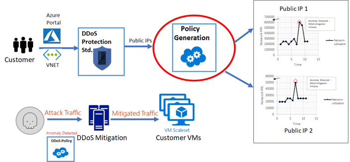 La protezione DDoS Standard applica tre auto-tuned mitigation policies (TCP SYN, TCP & UDP) per ogni IP Pubblico associato a una risorsa protetta, che risiede quindi su una virtual network con il servizio DDoS standard attivo.