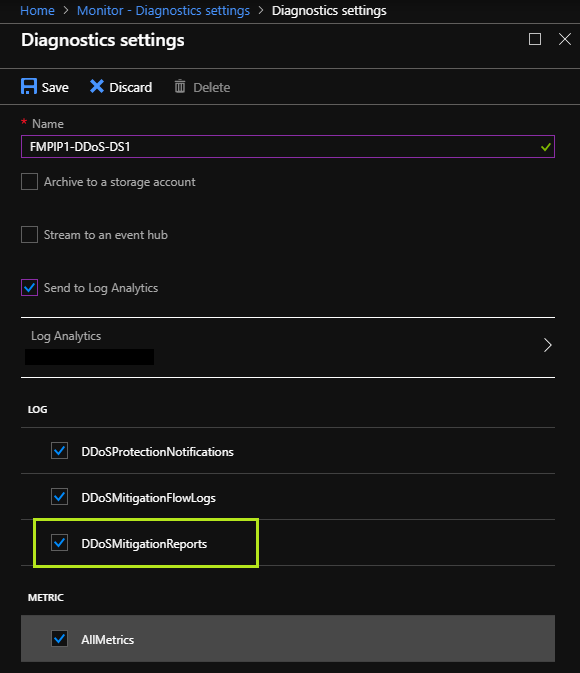 Nelle impostazioni di diagnostica c’è la possibilità di collezionare anche altri log relativi alle attività di mitigation e alle notifiche. Per maggiori informazioni a riguardo è possibile consultare la sezione Configure DDoS attack analytics della documentazione Microsoft. Le metriche per la protezione DDoS Standard vengono mantenute in Azure Moniotr per 30 giorni.